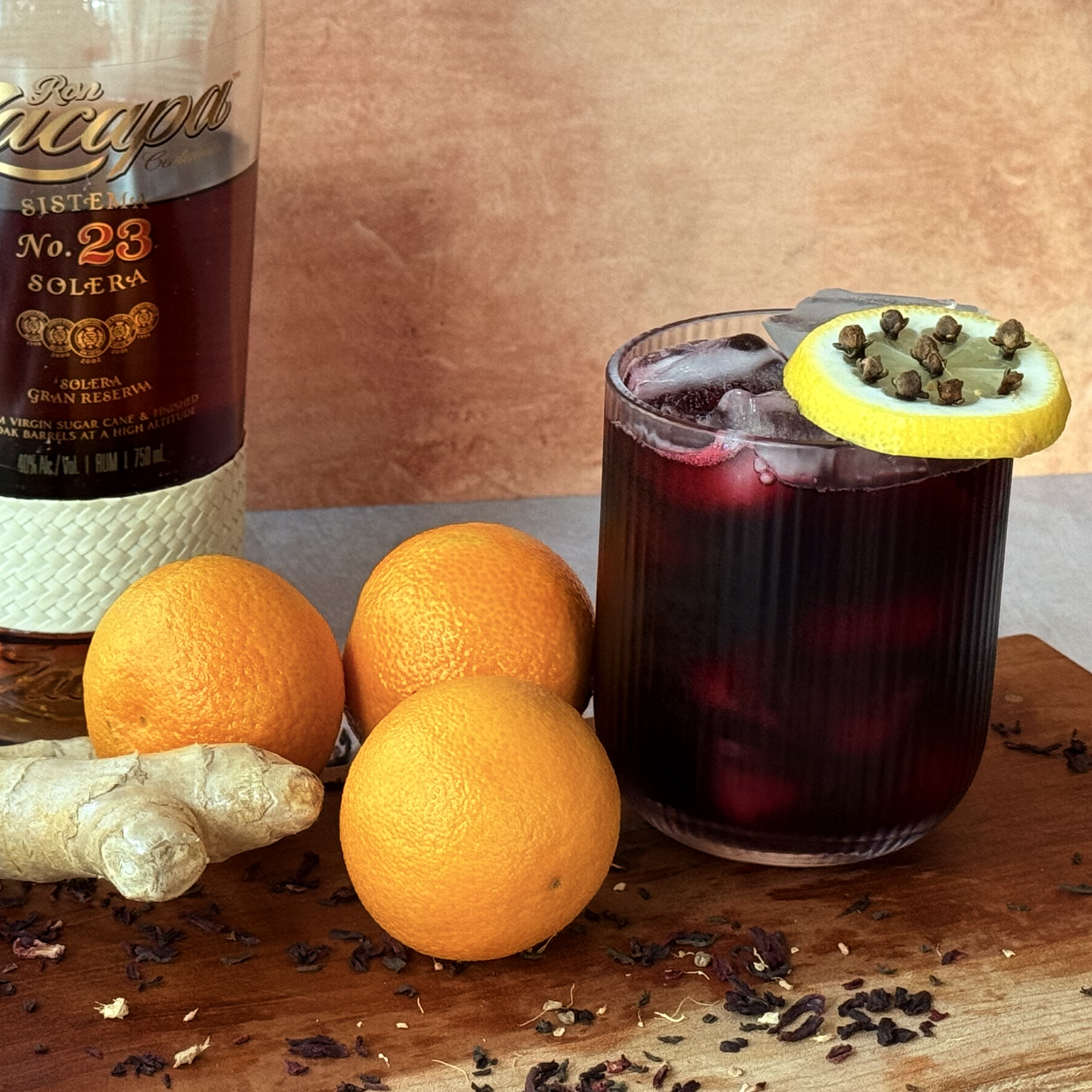 A refreshing yet cozy cocktail crafted with mulled hibiscus tea, infused with the warmth of ginger syrup and a splash of bright lemon. Topped with soda water for a bubbly finish, this versatile drink can be enjoyed as is or spiked with the rich, caramel notes of Ron Zacapa rum. Perfect for any occasion, it’s a balance of vibrant flavors and light sophistication.